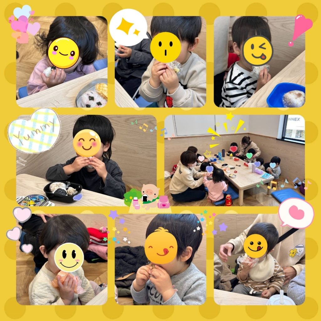 お家の方が作ってくれたおにぎりをにこにこ笑顔で食べる子どもたち♡♡
